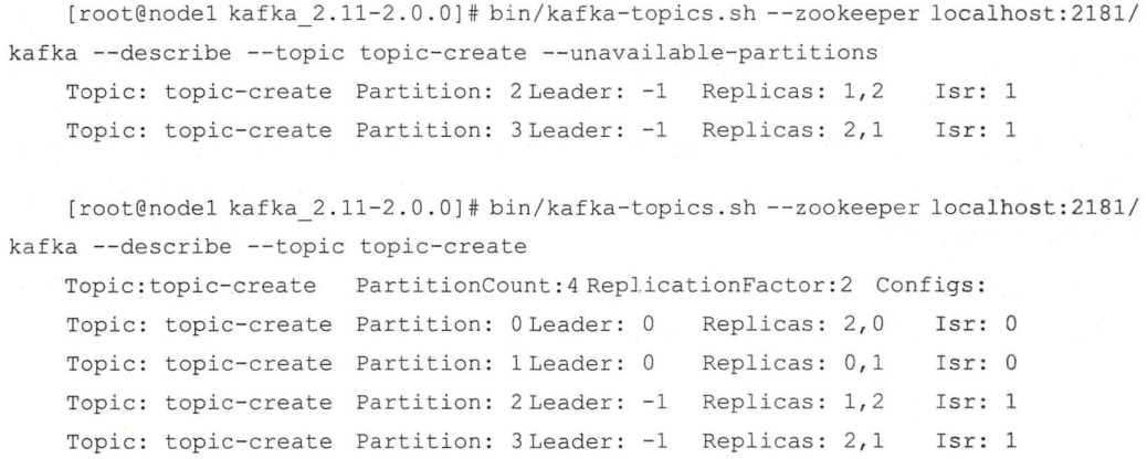 通过 unavailable-partitions参数可以查看主题中没有 leader副本的分区,这些分区已经处于离线状态,对于外界的生产者和消费者来说处于不可用的状态。