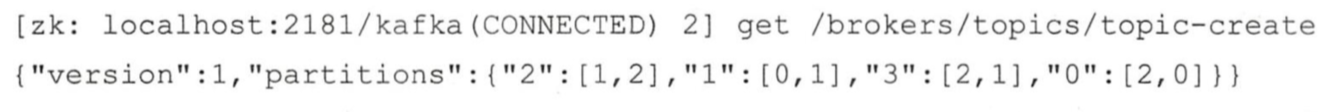 我们不仅可以通过日志文件的根目录来查看集群中各个 broker 的分区副本的分配情况,还可以通过 ZooKeeper 客户端来获取。当创建一个主题时会在 ZooKeeper 的/brokers/topics/目录下创建一个同名的实节点,该节点中记录了该主题的分区副本分配方案。示例如下 :