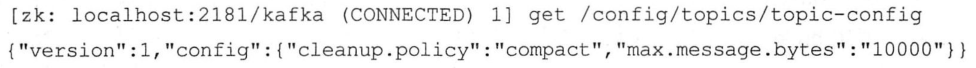 可以看到 Configs 一栏 中包含了创建时所设置的参数。我们还可以通过 ZooKeeper 客户端查看所设置的参数,对应的 ZooKeeper 节点为/config/topics/[topic] , 示例如下 :