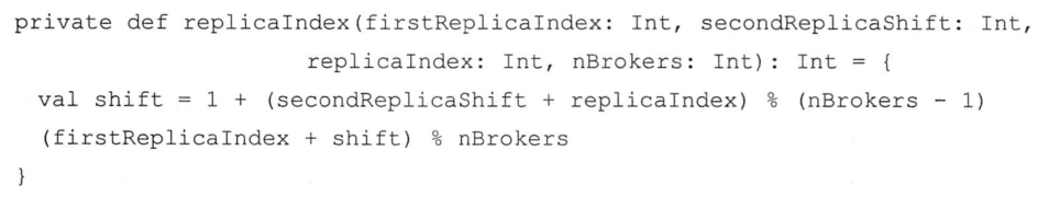 nextReplicaShift表示下一次副本分配相对于前一次分配的位移量,从字面上理解有点绕口。举个例子:假设集群中有3个 broker节点,对应于代码中的 brokerArray,创建的某个主题中有3个副本和6个分区,那么首先从 partitionEd( partition的编号)为0的分区开始进行分配,假设第一次计算(由 rand.nextInt(brokerArray.length)随机产生)得到的 nextReplicaShift值为1,第一次随机产生的 startIndex值为2,那么 partitionId为0的第一个副本的位置(这里指的是brokerArray的数组下标) firstReplicalndex=(currentPartitionId+ startIndex)%brokerArray.length=(0+2)%3=2,第二个副本的位置为 replicaIndex(firstReplicalndex, nextReplicaShift,j, brokerArray.length)= replicalndex(2, nextReplicaShift+1,0,3)=?,这里引入了一个新的方法 replicalndex(),不
