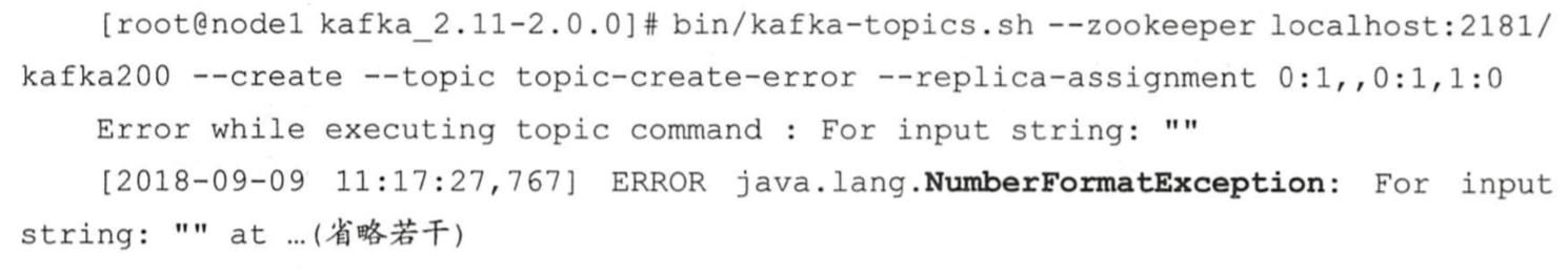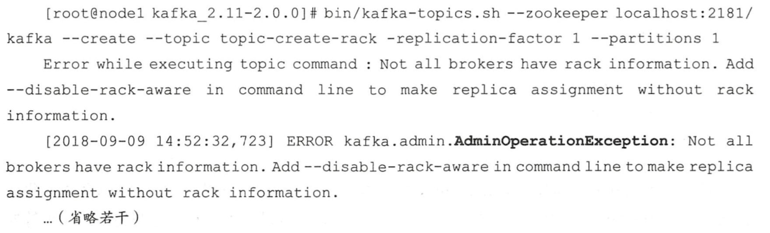如果一个集群中有部分 broker指定了机架信息,并且其余的 broker没有指定机架信息,那 么在执行 kafka-topics.sh 脚本创建主题时会报出的 AdminOperationException 的异常,示例如下 :