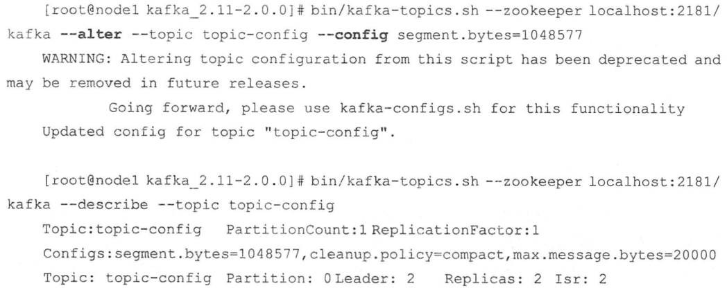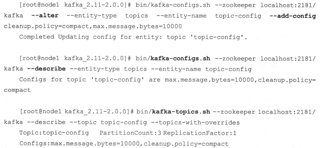 下面的示例中演示了将主题 topic-config的max.message.bytes配置值从1000修改为2000,示例如下: