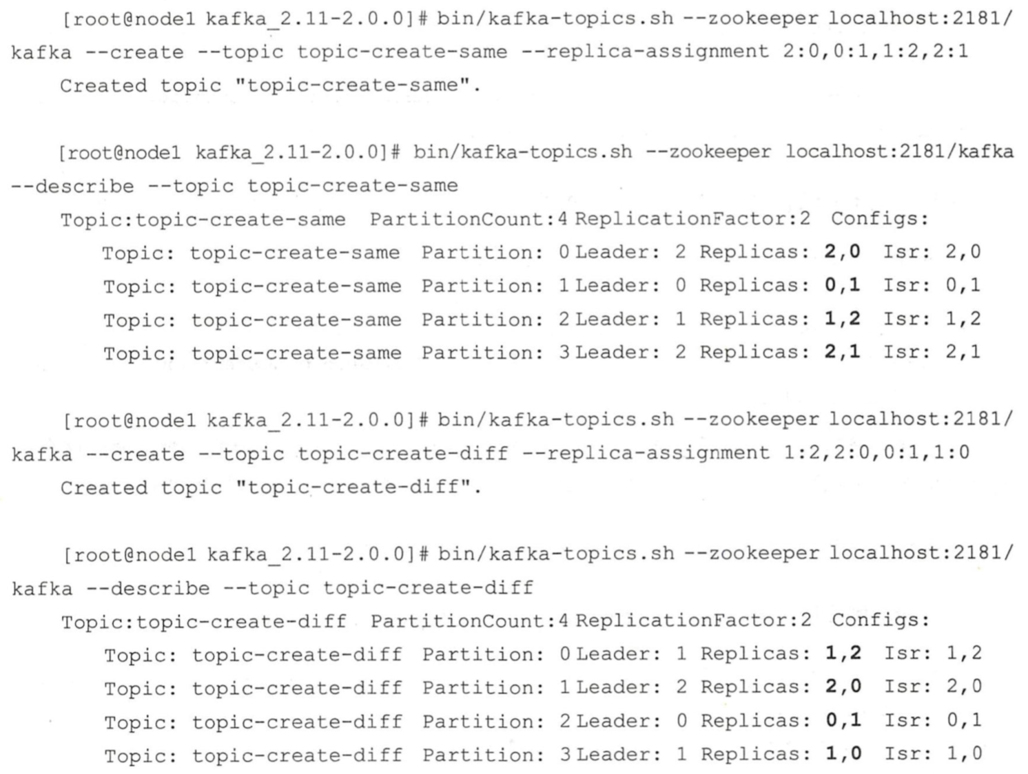 我们可以通过 replica-assignment 参数来创建一个与主题 topic-create相同的分配方案 的主题 topic-create-same 和不同的分配方案的主题 topic-create-same, 示例如下: