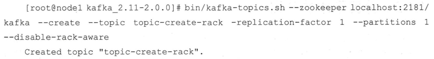 此时若要成功创建主题, 要么将集群中的所有 broker都加上机架信息或都去掉机架信息,要么使用 disable-rack-aware参数来忽略机架信息,示例如下: