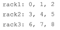相比较而言,指定机架信息的分配策略比未指定机架信息的分配策略要稍微复杂一些,但主体思想并没相差很多,只是将机架信息作为附加的参考项。假设目前有3个机架rack1、rack2和rack3,Kafka集群中的9个 broker点都部署在这3个机架之上,机架与 broker节点的对照关系如下: