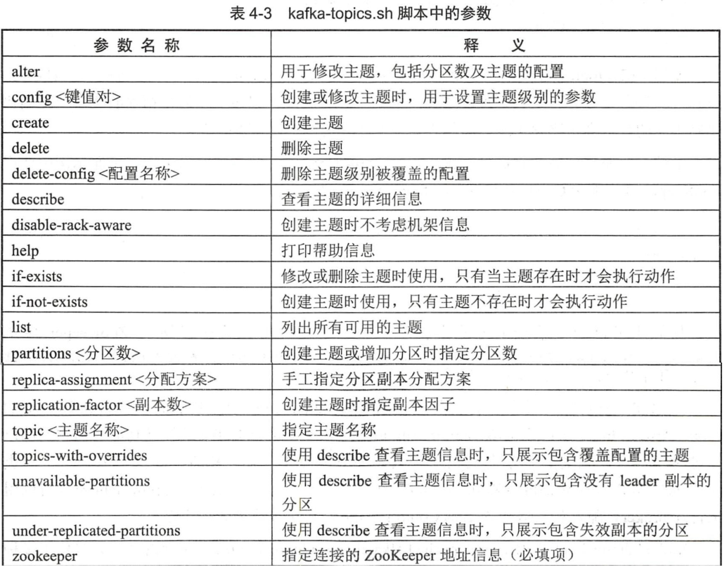 注意,删除主题是一个不可逆的操作。一旦删除之后,与其相关的所有消息数据会被全部删除,所以在执行这一操作的时候也要三思而后行。介绍到这里,基本上 kafka-topics.sh脚本的使用也就讲完了,为了方便读者查阅,表4-3中列出了所有 kafka-topics.sh脚本中的参数。读者也可以通过执行无任何参数的 kafka-topics.sh脚本,或者执行 kafka-topics.sh -help来查看帮助信息。