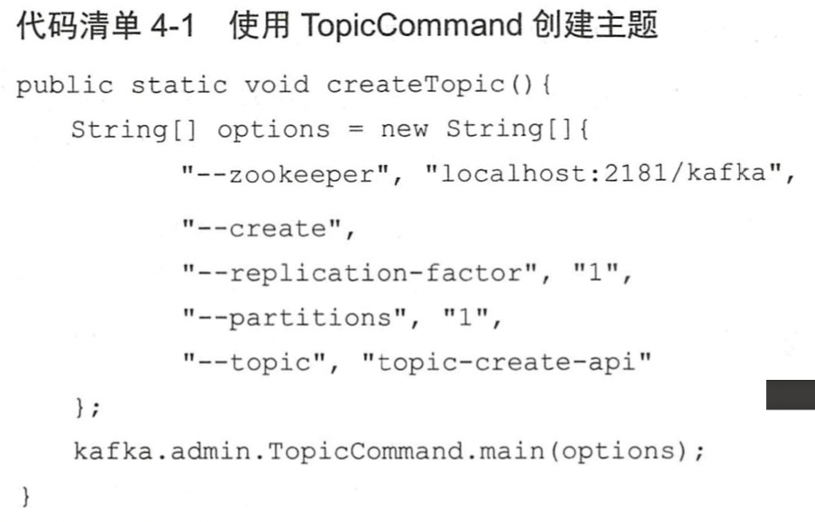本节开头就提及了 kafka-topics.sh 脚本实质上是调用了 kafka.admin.TopicCommand 类,通过向 TopicCommand 类中传入一些关键参数来实现主题的管理。我 们也可以直接调用 TopicCommand 类中的 main()函数来直接管理主题,比如这里创建一个分区数为 1、副本因子为 1 的主题 topic-create-api, 如代码清单 4-1 所示。