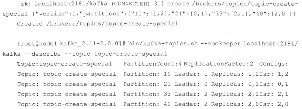 我们再创建一个另类的主题,分配情况和主题 topic-create一样,唯独分区号已经与主题topic-create-special大相径庭,示例如下: