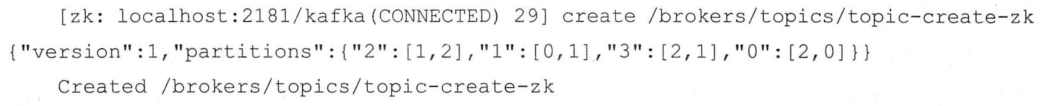 知道了 kafka-topics.sh脚本的实质之后,我们可以直接使用 ZooKeeper的客户端在/brokers/topics节点下创建相应的主题节点并写入预先设定好的分配方案,这样就可以创建一个新的主题了。这种创建主题的方式还可以绕过一些原本使用 kafka-topics.sh脚本创建主题时的一些限制,比如分区的序号可以不用从0开始连续累加了。首先我们通过 ZooKeeper客户端创建一个除了与主题 topic-create名称不同其余都相同的主题 topic-create-zk,示例如下: