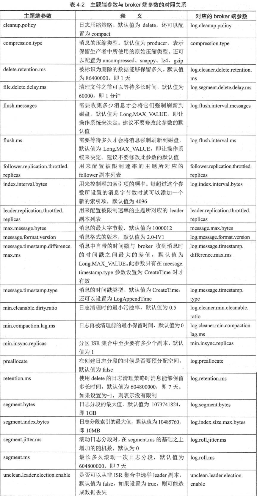 与主题相关的参数也有很多,由于篇幅限制,在前面的配置变更的示例中难以一一列出所有的参数,但是从配置变更的角度而言,其操作方式都是一样的。为了便于读者查阅,表4-2列出了主题端参数与 broker端参数的对照关系。