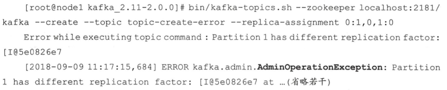 如果分区之间所指定的副本数不同,比如 0:1 , 0 ,1:1 这种就会报出 AdminOperationException 异常, 示例如下: