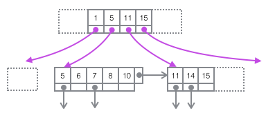 B+树适合作为数据库的基础结构,完全是因为计算机的内存-机械硬盘两层存储结构。内存可以完成快速的随机访问(随机访问即给出任意一个地址,要求返回这个地址存储的数据)但是容量较小。而硬盘的随机访问要经过机械动作(1磁头移动 2盘片转动),访问效率比内存低几个数量级,但是硬盘容量较大。典型的数据库容量大大超过可用内存大小,这就决定了在B+树中检索一条数据很可能要借助几次磁盘IO操作来完成。如下图所示:通常向下读取一个节点的动作可能会是一次磁盘IO操作,不过非叶节点通常会在初始阶段载入内存以加快访问速度。同时为提高在节点间横向遍历速度,真实数据库中可能会将图中蓝色的CPU计算/内存读取优化成二叉搜索树(InnoDB中的page directory机制)。