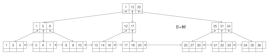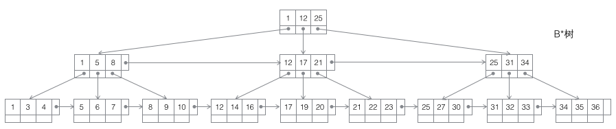 3 B+树:一棵m阶B树是一棵平衡的m路搜索树。最重要的性质是每个非根节点所包含的关键字个数 j 满足:┌m/2┐ - 1 <= j <= m;子树的个数最多可以与关键字一样多。非叶节点存储的是子树里最小的关键字。同时数据节点只存在于叶子节点中,且叶子节点间增加了横向的指针,这样顺序遍历所有数据将变得非常容易。