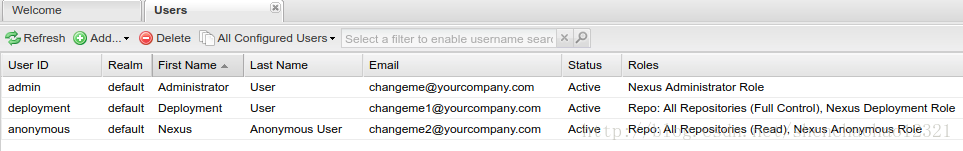 Nexus预定义了三个用户,以admin登陆后,单击页面左边导航栏中的User链接,就能看到所有已定义用户的列表,如下图: