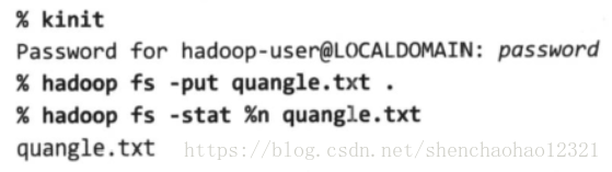 下面我们来看一个例子。首先,将core-site.xml文件中的hadoop.security.authentication属性项设置为kerberos,启用Kerberos认证。该属性项的默认是simple,表示将采用传统的向后兼容(但是不安全)方式,即利用操作系统用户名称来决定登录者的身份。