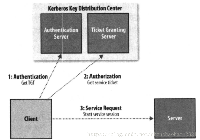从宏观角度来看,使用Kerberos时,一个客户端要经过三个步骤才可以获得服务。在各个步骤,客户端需要和一个服务器交换报文。