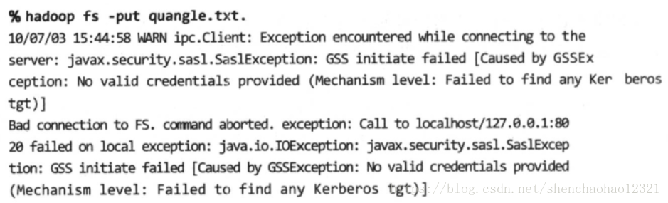 ACL的格式很简单,前一段是以逗号隔开的用户名称列表,后一段是以逗号隔开的组名称列表,两段间以空格隔开。例如,ACL片段preston,howard,directors,inventors会将某服务的访问权限授予用户preston或用户howard,或组directors、组inventors。当Kerberos认证启用后,以下输出内容显示了从本地复制一个文件到HDFS中时系统反馈的结果。