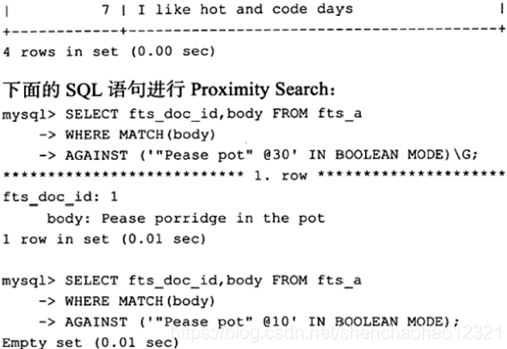 - @distance表示查询的多个单词之间的距离是否在 distance之内, distance的单位是字节。这种全文检索的查询也称为Proximity Search。如 MATCH(body) AGAINST('"Pease pot"@30' IN BOOLEAN MODE)表示字符串 Pease和pot之间的距离需在30字节内。