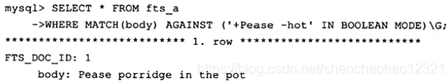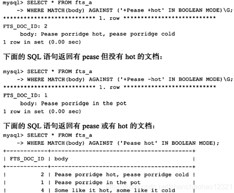 MySQL数据库允许使用 IN BOOLEAN MODE修饰符来进行全文检索。当使用该修饰符时,査询字符串的前后字符会有特殊的含义,例如下面的语句要求查询有字符串Pease但没有hot的文档,其中+和-分别表示这个单词必须出现,或者一定不存在。