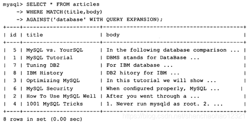 可以看到,查询返回了3条记录,body字段包含 database关键字。接着开启 Query Expansion,观察最后得到的结果如下所示
