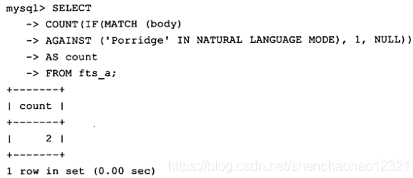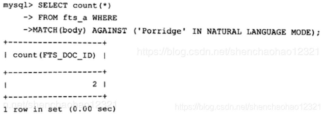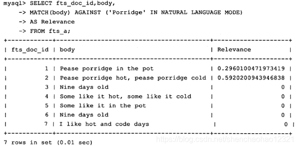 SELECT FROM fts_a WHERE MATCH(body) AGAINST ('Porridge');