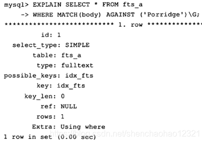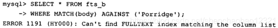可以看到,在vype这列显示了 fulltext,即表示使用全文检索的倒排索引,而key这列显示了 idx_fts,表示索引的名字。可见上述查询使用了全文检索技术。同时,若表没有创建倒排索引,则执行 MATCH函数会抛出类似如下错误: