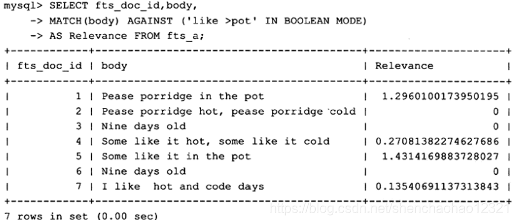 上述SQL语句查询根据是否有单词like或pot进行相关性统计,并且出现单词pot后相关性需要增加。文档4虽然出现两个like单词,但是没有pot,因此相关性没有文档1和5高。