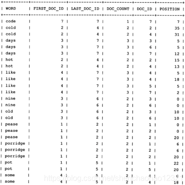 可以看到每个word都对应了一个 DOC_ID和POSITION。此外,还记录了 FIRST_DOC_ID、LAST_DOC_ID以及DOC_COUNT,分别代表了该word第一次出现的文档ID,最后一次出现的文档ID,以及该word在多少个文档中存在。