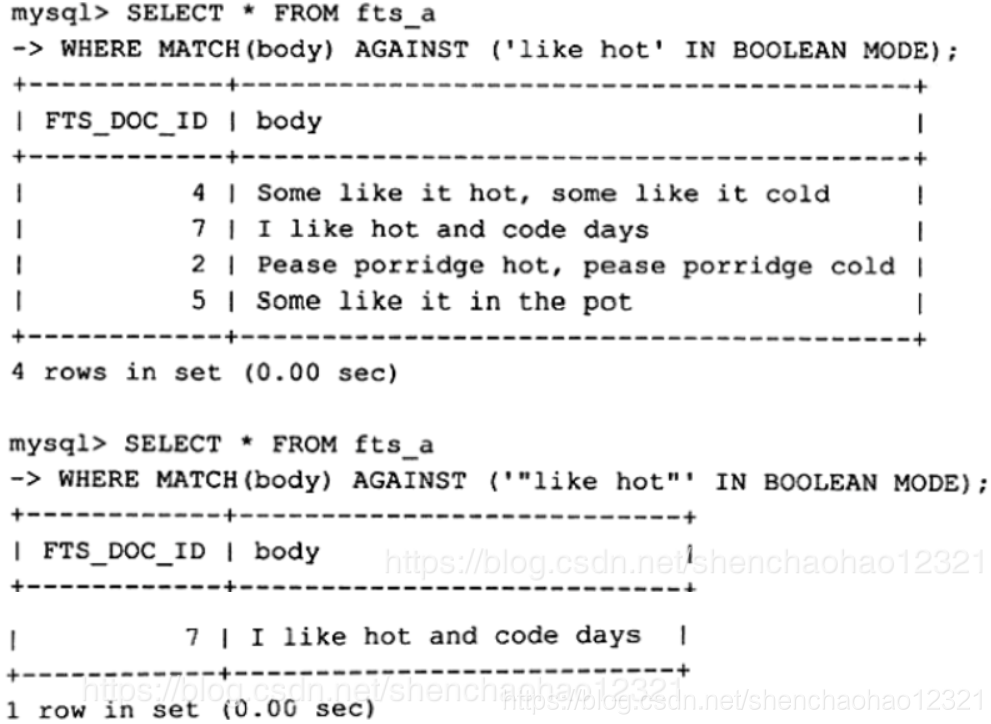 可以看到第一条SQL语句没有使用""将like和hot视为一个短语,而只是将其视为两个单词,因此结果共返回4个文档。而第二条SQL语句使用"like hot'",因此查询的是短语,故仅文档4符合查询条件。