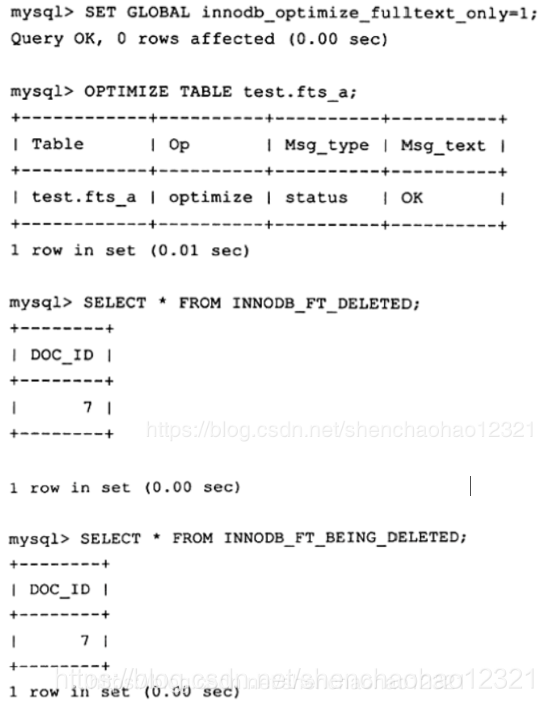 可以看到删除的文档ID插人到了表 INNODB_FT_DELETED中,若用户想要彻底删除倒排索引中该文档的分词信息,那么可以运行如下的SQL语句: