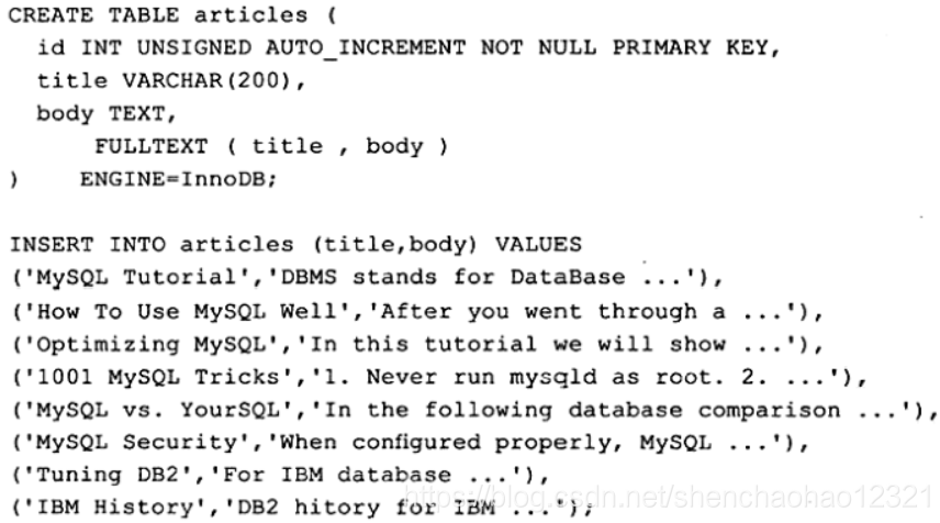 上述代码创建了表fsa,由于body字段是进行全文检索的字段,因此创建一个类型为 FULLTEXT的索引。这里首先导入数据,然后再进行倒排索引的创建,这也是比较推荐的一种方式。