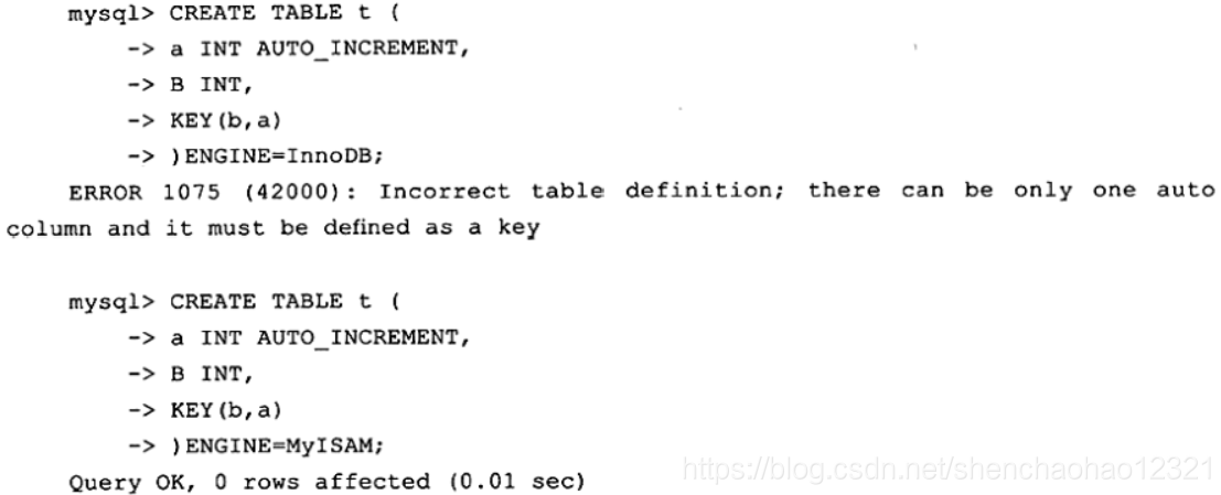 另外,在 InnoDB存储引擎中,自增长值的列必须是索引,同时必须是索引的第一个列。如果不是第一个列,则 MySQL数据库会抛出异常,而 MyISAM存储引擎没有这个问题,下面的测试反映了这两个存储引擎的不同。