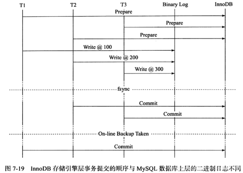 一旦步骤2)中的操作完成,就确保了事务的提交,即使在执行步骤3)时数据库发生了宕机。此外需要注意的是,每个步骤都需要进行一次 fsync操作才能保证上下两层数据的一致性。步骤2)的 fsync由参数sync_binlog控制,步骤3)的 fsync由参数innodb_flush_log_at_trx_commit控制。因此上述整个过程如图7-18所示。