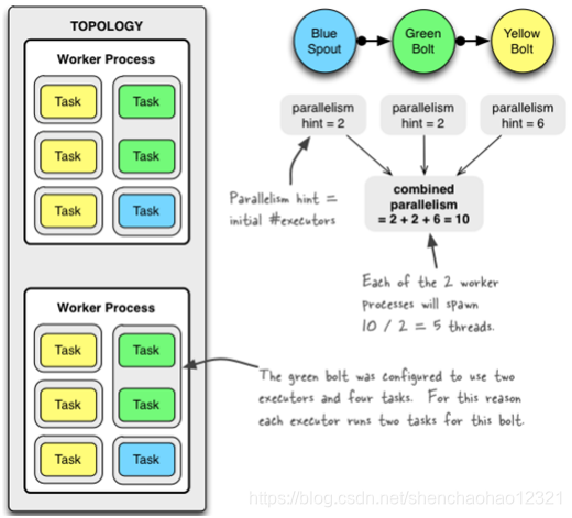 3个组件的并发度加起来是10,就是说拓扑一共有10个executor,一共有2个worker,每个worker产生10 / 2 = 5条线程。绿色的bolt配置成2个executor和4个task。为此每个executor为这个bolt运行2个task。