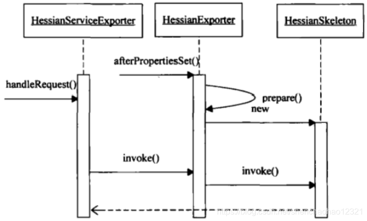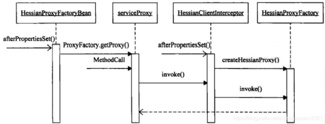在如图所示的设计时序中可以看到,在HttpInvokerProxyFactoryBean中设置了serviceProxy对象作为远端服务的本地代理对象。这个代理对象的设置是在依赖注入完成以后,通过afterPropertiesSet来对远端调用进行设置。这个afterPropertiesSet完成的设置包括:使用ProxyFactory生成代理对象、为代理对象设置代理接口方法,并把ProxyFactory生成的代理对象设置给serviceProxy。可以看到,在我们熟悉的FactoryBean的接口方法getobject()的实现中,把这个serviceτoxy对象,也就是生成的代理对象,提供给了访问远端调用的客户端应用。在生成这个AOP的代理对象并设置好为其配置的拦截器之后,远端服务巳经可以工作了,在代理对象对应的远端方法被调用的时候,实际上会调用serviceProxy对象的代理方法。这个代理方法会触发HttpInvokerClientInterceptor的拦截器方法,在拦截器中封装了具体对远端调用,比如通过HTTP协议调用远端方法的处理,这些处理通过调用SimpleHttpInvokerRequestExecutor的executeRequest()方法来实现。而最终的实现是在doExecuteRequest()方法中封装完成的。