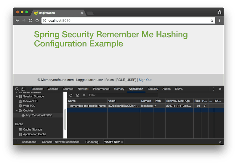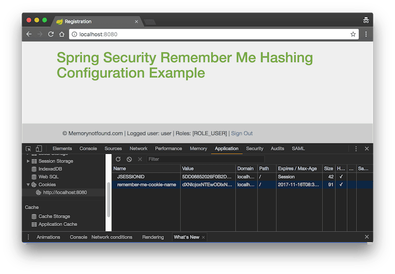当检查我们的应用程序的cookie时,我们可以看到Spring创建了我们之前配置的remember-me-cookie-namecookie。
