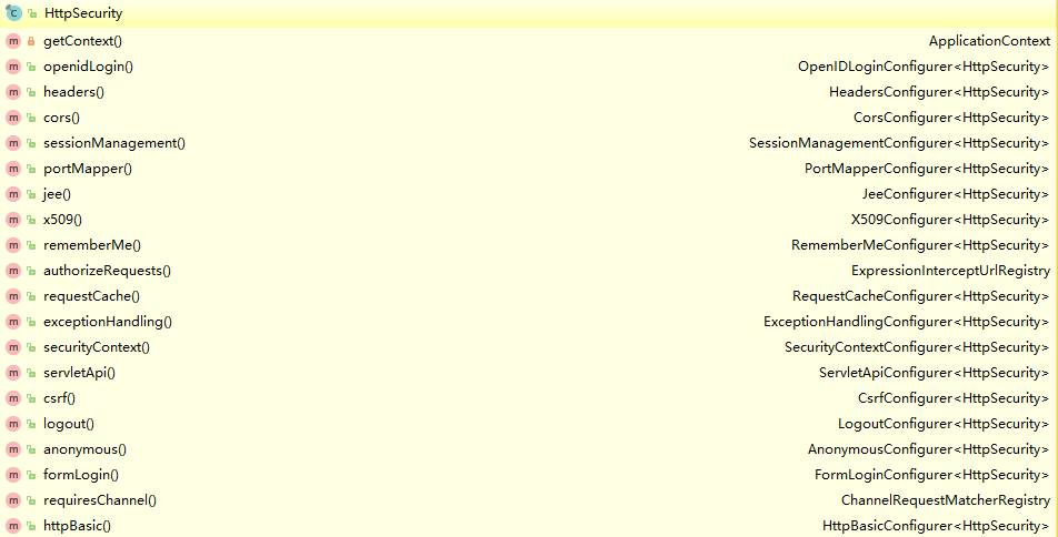 他们分别代表了http请求相关的安全配置,这些配置项无一例外的返回了Configurer类,而所有的http相关配置可以通过查看HttpSecurity的主要方法得知: