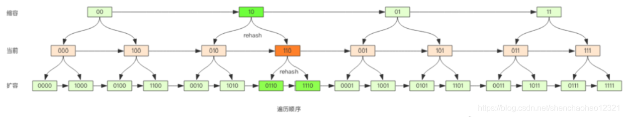 再考虑缩容,假设当前即将遍历 110 这个位置 (橙色),那么缩容后,当前槽位所有的元素对应的新槽位是 10(深绿色),也就是去掉槽位二进制最高位。这时我们可以直接从 10 这个槽位继续往后遍历,10 槽位之前的所有槽位都是已经遍历过的,这样就可以避免缩容的重复遍历。不过缩容还是不太一样,它会对图中 010 这个槽位上的元素进行重复遍历,因为缩融后 10 槽位的元素是 010 和 110 上挂接的元素的融合。