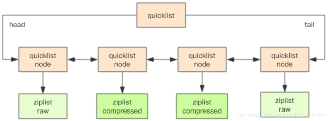 上述代码简单地表示了 quicklist 的大致结构。为了进一步节约空间,Redis 还会对 ziplist 进行压缩存储,使用 LZF 算法压缩,可以选择压缩深度。