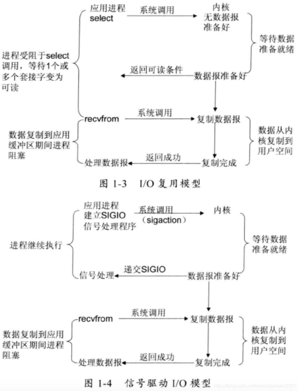 - 信号驱动I/O模型:首先开启套接口信号驱动I/O功能,并通过系统调用 sigaction执行一个信号处理函数(此系统调用立即返回,进程继续工作,它是非阻塞的)。当数据准备就绪时,就为该进程生成一个 SIGIO信号,通过信号回调通知应用程序调用 recvfrom来读取数据,并通知主循环函数处理数据,如图1-4所示。