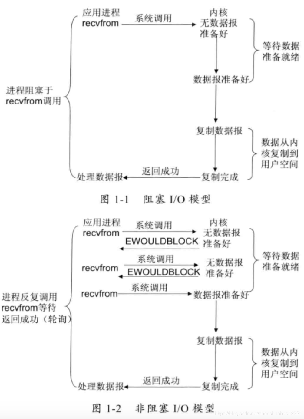 - 非阻塞I/O模型: recvfrom从应用层到内核的时候,如果该缓冲区没有数据的话,就直接返回一个 EWOULDBLOCK错误,一般都对非阻塞IO模型进行轮询检查这个状态,看内核是不是有数据到来,如图1-2所示。