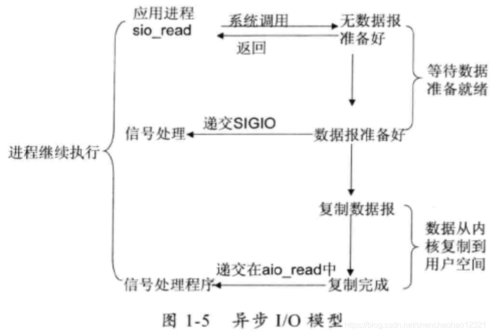 - 异步I/O:告知内核启动某个操作,并让内核在整个操作完成后(包括将数据从内核复制到用户自己的缓冲区)通知我们。这种模型与信号驱动模型的主要区别是:信号驱动I/O由内核通知我们何时可以开始一个I/O操作;异步I/O模型由内核通知我们I/O操作何时已经完成,如图1-5所示。