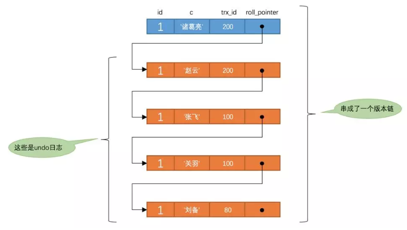 每次对记录进行改动,都会记录一条undo日志,每条undo日志也都有一个roll_pointer属性(INSERT操作对应的undo日志没有该属性,因为该记录并没有更早的版本),可以将这些undo日志都连起来,串成一个链表,所以现在的情况就像下图一样: