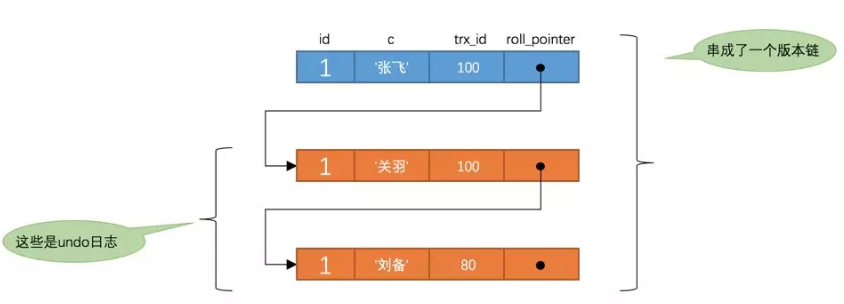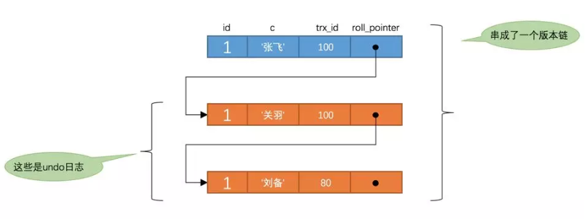 c的内容是'张飞',该版本的trx_id值为100,在m_ids列表内,所以不符合可见性要求,根据roll_pointer跳到下一个版本。 -