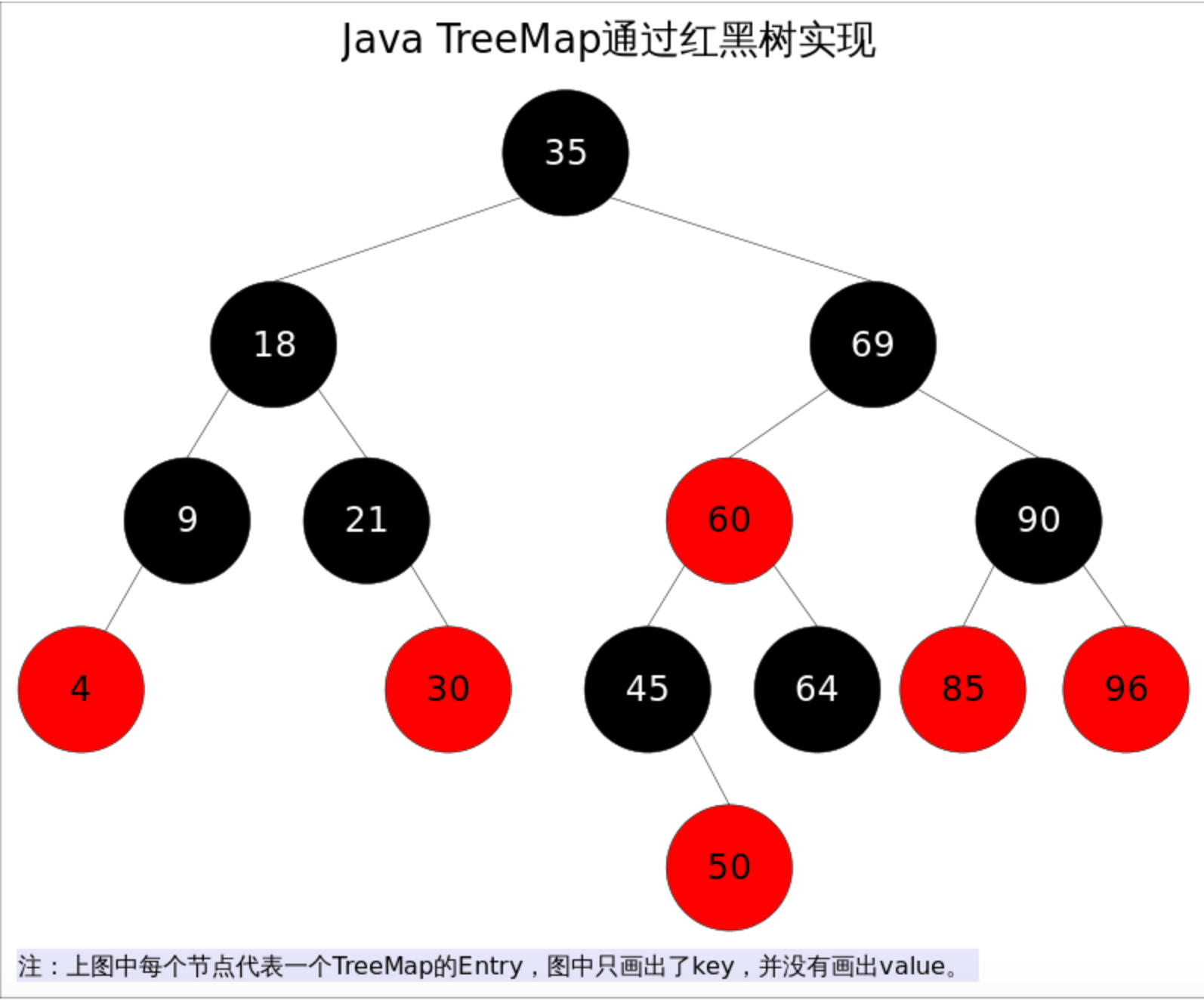 TreeMap底层通过红黑树(Red-Black tree)实现,也就意味着containsKey(), get(), put(), remove()都有着log(n)的时间复杂度。其具体算法实现参照了《算法导论》。