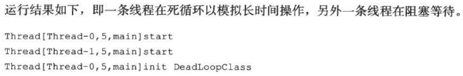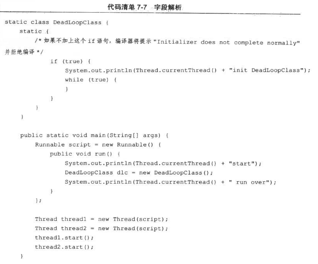 - 虚拟机会保证一个类的<clinit>()方法在多线程环境中被正确地加锁、同步,如果多个线程同时去初始化一个类,那么只会有一个线程去执行这个类的<clinit>()方法,其他线程都需要阻塞等待,直到活动线程执行<clinit>()方法完毕。如果在一个类的<clinit>()方法中有耗时很长的操作,就可能造成多个进程阻塞[2],在实际应用中这种阻塞往往是很隐蔽的。