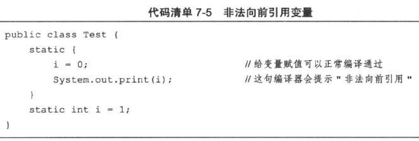 - <clinit>()方法是由编译器自动收集类中的所有类变量的赋值动作和静态语句块(static{}块)中的语句合并产生的,编译器收集的顺序是由语句在源文件中出现的顺序决定的,静态语句块中只能访问到定义在静态语句块之前的变量,定义在它之后的变量,在前面的静态语句块可以赋值,但是不能访问,如代码清单7-5所示。