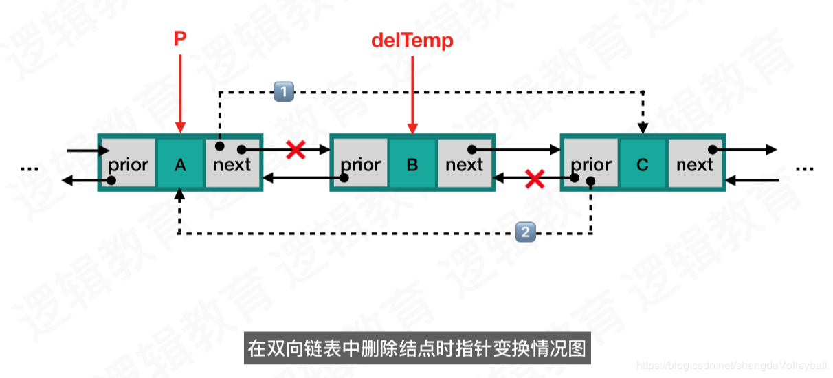 // 6、如果删除的结点的下一个结点不为空,则将要删除的结点的下一个结点的前驱指向要删除的上一个结点