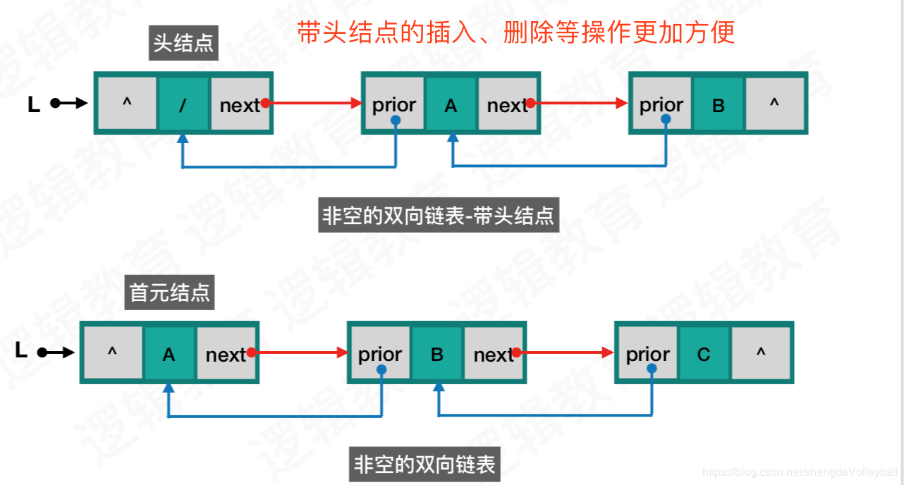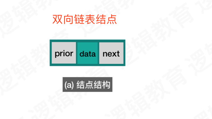 双向链表的结点有连个指针域,一个(prior)指向钱一个结点,一个(next)指向后一个结点。