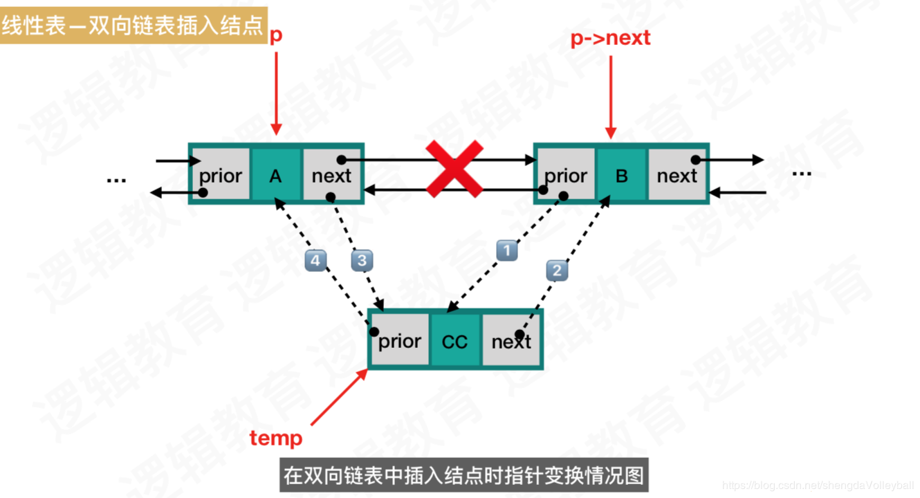 //(1)、将p->next(插入位置后一个结点)的前驱 prior = temp;